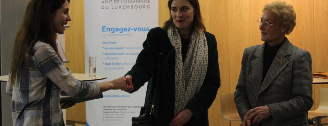 En présence de la vice-présidente de la Fondation Luis Portabella Y Conte Lacoste, Madame Alexandra DA SILVA, de la présidente des Amis de l’Université, Madame Erna HENNICOT-SCHOEPGES et du chargé de direction, Monsieur Romain PENNING, de la conseillère du vice-président des Affaires Académique, Madame Stefanie KNILL ainsi que des représentants des 3 facultés de l’université, les quatre étudiants ont reçu, lors d’une petite réception à la Maison du Savoir au campus Belval, leur attestation bien méritée. Ils peuvent grâce à la fondation continuer leurs études de master dans de meilleurs conditions. Parmi les 40 candidatures ont été retenus : Elissavet CHASOMERI, 27 ans de nationalité grecque et Francesco CASCIO, 23 ans de nationalité italienne, tous deux de la Faculté des Lettres, des Sciences Humaines, des Arts et des Sciences de l’Éducation ; Arjana GJETA, 24 ans de nationalité albanaise de la Faculté de Droit, d’Économie et de Finance ; Mehri BANIASADI, 25 ans de nationalité iranienne de la Faculté des Sciences, de la Technologie et de la Communication.