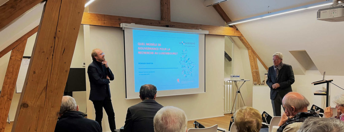 Le mardi 15 novembre 2022, une bonne trentaine de nos membres s’étaient retrouvés à la Maison Schuman pour assister à la conférence du Prof. Dr Romain Martin avec le titre : « Quel modèle de gouvernance pour la recherche au Luxembourg ? » Le Prof. Dr Rolf Tarrach, président des Amis de l’Université du Luxembourg avait fait auparavant l’introduction du conférencier. La soirée s’est terminée par le vin d’honneur obligatoire.