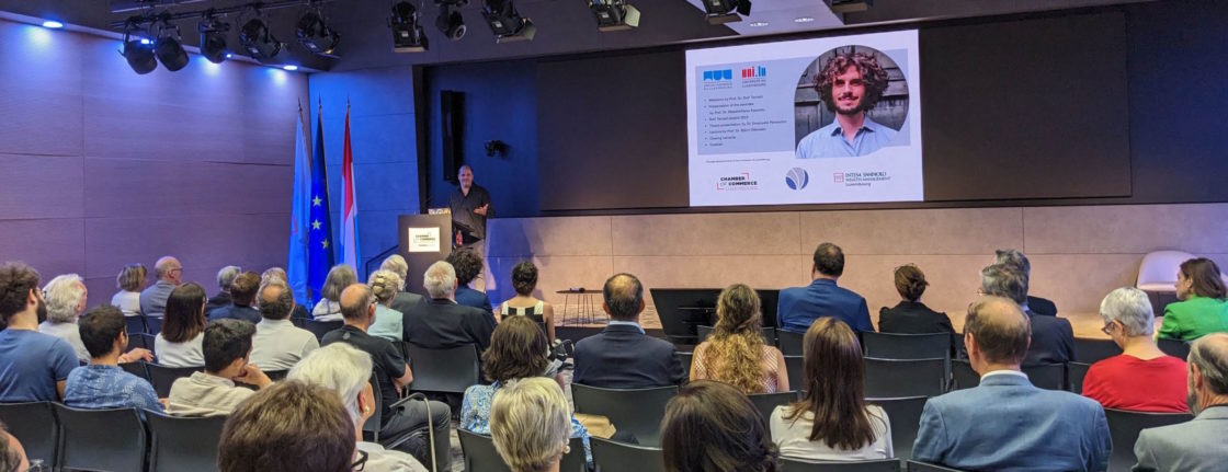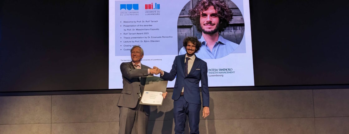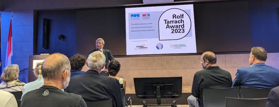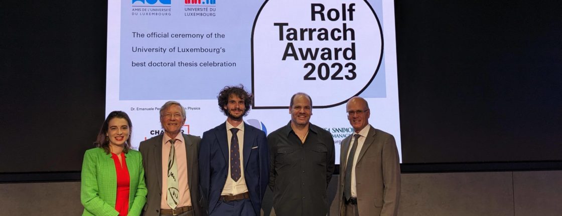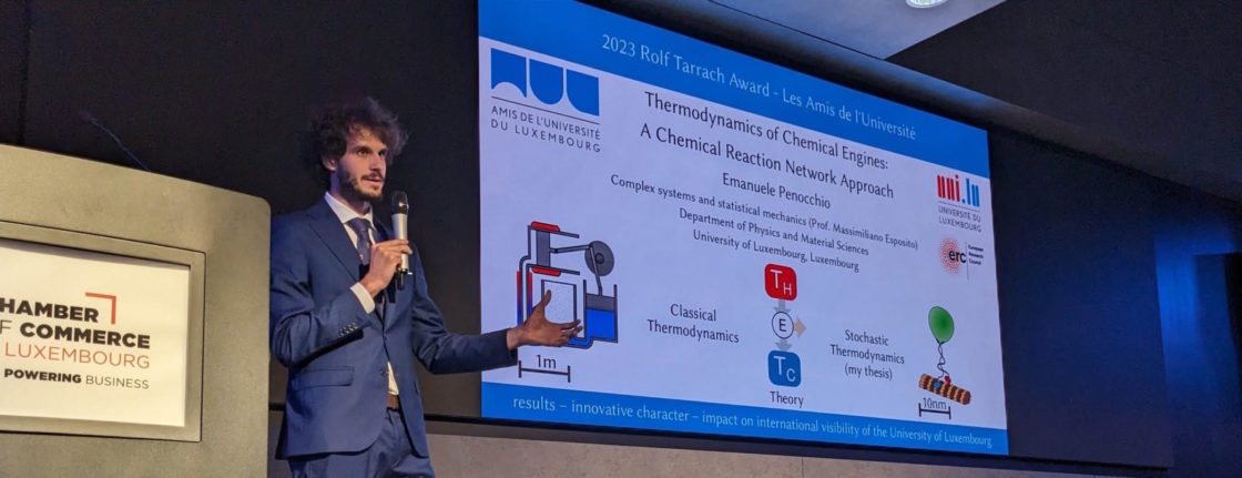 L’Association des Amis de l’Université du Luxembourg a décerné au Dr Emanuele Penocchio le prix de la meilleure thèse doctorale de l’Université du Luxembourg pour son travail exceptionnel sur « Thermodynamics of chemical engines: A chemical reaction network approach ». Plus de 70 participants du monde universitaire et de l’industrie ont assisté à la cérémonie qui s’est déroulée le 12 juillet 2023 à la Chambre de Commerce du Luxembourg. Le prix Rolf Tarrach vise à récompenser l’excellence dans le domaine de la recherche et à promouvoir la réputation internationale de l’Université du Luxembourg. Il est décerné depuis 2012 et le lauréat reçoit 10.000 €. Les 2 sponsors du prix sont la Fondation Luis y Antonio Portabella et la banque Intesa Sanpaolo Luxembourg s.a.
